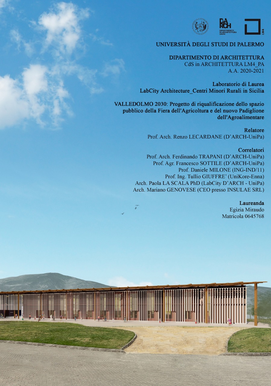 The project identifies an integrated system of public spaces for the Agricultural Fair in the northern urban area of the town, between Via Dante Alighieri and Via Alcide De Gasperi. The project envisions the logistical reorganization of the area and the construction of a new Agri-food Pavilion and permanent and temporary exhibition structures. The project proposes solutions geared toward urban and environmental sustainability, with energy-efficient buildings integrated into the urban fabric, creating a new gateway to the city of Valledolmo.